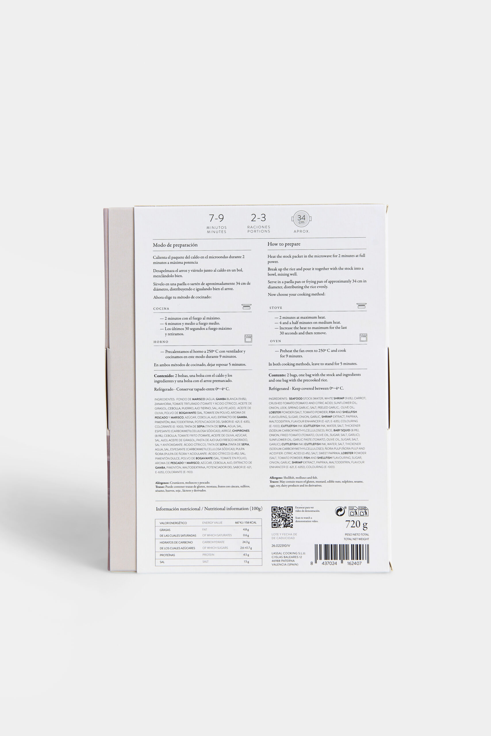 2 bolsas, una bolsa con el caldo y los ingredientes (chipirones), y una bolsa con el arroz premarcado.